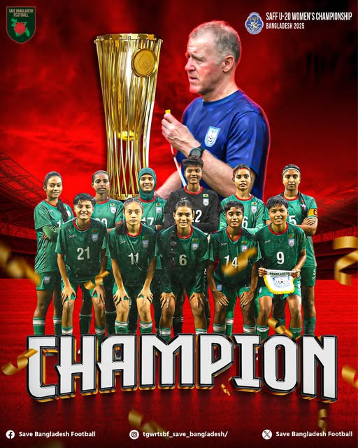ভারত না আসায় এবারের সাফ অনুর্ধ ২০ মেয়েদের চ্যাম্পিয়নশিপ চার দল (বাংলাদেশ, ভুটান, নেপাল, শ্রীলংকা) রাউন্ড রবিন পদ্ধতিতে হয়েছে। কাল ছিল দুই শীর্ষ দল বাংলাদেশ নেপালের মধ্যে অঘোষিত ফাইনাল। বৃহস্পতি এখন বাংলাদেশের মেয়েদের ফুটবলে তুঙ্গে। সম্প্রতি এশিয়া পর্যায়ে খেলার সুযোগ পেয়ে উড়ছে পিটার বাটলার শিষ্যরা। সদ্য শেষ হওয়া টুর্নামেন্ট জয় করবে সেটি অনুমিত ছিল। ৫ খেলায় প্রতিটি জিতে ১৫ পয়েন্ট নিয়ে শীর্ষে অবস্থান করা বাংলাদেশ কাল নেপালের বিরুদ্ধে ড্র করলেই যথেষ্ট ছিল। নেপাল কিন্তু টুর্নামেন্ট জুড়ে গোল প্লাবন বইয়ে দিয়েছে। কাল সেই নেপাল দলকেই ৪-০ গোলের বিশাল ব্যাবধানে হারিয়ে শিরোপা অক্ষুন্ন রেখেছে বাংলার মেয়েরা। যেভাবে সাগরিকা, তৃষ্ণা, কৃষ্ণা, মুনকি, আফাইদারা খেলেছে ভারত আসলেও ভিন্ন কিছু হতো বলে মনে হয় না। নেপালের বিরুদ্ধে প্রথম খেলায় সাগরিকাকে লাল কার্ড দেয়ার পর তিন ম্যাচ খেলতে পারেনি। কাল সুযোগ পেয়েই সুযোগ সন্ধানী সাগরিকা একাই ৪ গোল করেছে অসামান্য দক্ষতায়। বাংলাদেশ আক্রমণাত্মক ফুটবল উপহার দিয়ে দাঁড়াতেই দেয়নি নেপাল দলকে। পূর্ণিমারা বাংলাদেশ রক্ষণ ভাগে খুব একটা চ্যালেঞ্জ সৃষ্টি করতে পারেনি। বাংলাদেশের সামনে সুযোগ ছিল আরো বড় ব্যাবধানে জয়ী হওয়ার। ভালো লেগেছে অধিনায়ক আফাইদা ম্যাচ শেষে বলেছে কাল শোক কাতর হয়ে বাংলাদেশ দল প্রত্যয় নিয়ে ম্যাচ খেলেছে। জয় উৎসর্গ করেছে বিমান দুর্ঘটনায় নিহত আহত শিশু কিশোরদের উদ্দেশে।