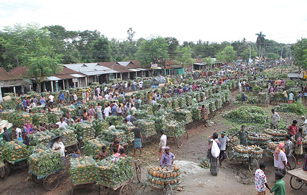 পরেরদিন আমরা সকালেই রওনা দিলাম মধুপুরের উদ্দেশে। এতদূর এসে মধুপুর জঙ্গলে না গেলে চলে! মানুষের আদিম বাসস্থানের কাছে গেলে নিজেরও আদিম হতে ইচ্ছে করে। ভুয়াপুরের মতো মধুপুরও টাঙ্গাইলের একটি উপজেলা। ভুয়াপুর থেকে ফলদা বাজার। সেখান থেকে সিএনজি অটোরিকশাতে এলাম ঘাটাইল। সেখান থেকে আমরা চললাম মধুপুরের পথে। যেতে যেতে চোখে পড়ল দুই পাশের বিশাল বিশাল ধানী জমি। বুঝতে কষ্ট হলো না, এখানকার অর্থনীতি কৃষিনির্ভর। মধুপুর সদরে ঢুকতে আমাদের স্বাগত জানালো বিশাল এক আনারসের চত্বর। তার চারপাশে সিএনজি অটোরিকশার সারি। একটু এগিয়ে আমরা গেলাম মধুপুরের কবি শুভ্রের সঙ্গে সাক্ষাৎ করতে। এখানে এক ফার্মেসি খুলে দিব্যি জীবনযাপন করছেন তিনি। তিন জনে হালকা চা নাস্তা সেরে রওনা দিলাম মধুপুর জঙ্গলের উদ্দেশে। সিএনজি অটোরিকশা রিজার্ভ করলাম ৩০০ টাকা দিয়ে। তবে মধুপুর জঙ্গলে যেতেই পড়তে হলো বিড়ম্বনায়। রাস্তায় যে বিরাট গর্ত হয়ে আছে! অনেক কষ্টে সেটি পেরোল সিএনজি অটোরিকশা। মধুপুর গড়ের বিখ্যাত জায়গা এটি। যেতে যেতে চোখে পড়ল এই ক্রান্তীয় বনভূমির শালবনের সারি। তবে মনটাও খারাপ হলো। জঙ্গল কেটে সাফ করে ফেলা হয়েছে। সেখানে শুরু হয়েছে বাণিজ্যিক চাষ। বিশেষ করে আনারস। টাঙ্গাইল যদি চমচমের শহর হয় তবে মধুপুর আনারসের রাজ্য। এখানকার রসালো, সুস্বাদু আনারসের খ্যাতি সুবিদিত। আমরাও সেই স্বাদ নিলাম। ছোট আনারস কেটেকুটে দিয়ে প্রতি পিস নিল ২০ টাকা করে। আনারস মুখে দিয়ে আমরা ঢুকলাম জঙ্গলে। চারদিকে সবুজ আর সবুজ। বনের মাঝ দিয়ে চলে গেছে রাস্তা। মানুষের হাঁটাহাঁটির ফলে যেমনটা হয়। কিছু আগেই বৃষ্টি হয়েছে। আর ছিনতাইয়ের ভয়ে আমরা বেশিদূর এগোলাম না। সবুজ বনের কিছু ছবি আর পাখাপাখালি আর ঝিঁ ঝিঁর ডাকের ডাকের সঙ্গে সুর মিলিয়ে ফিরে এলাম।