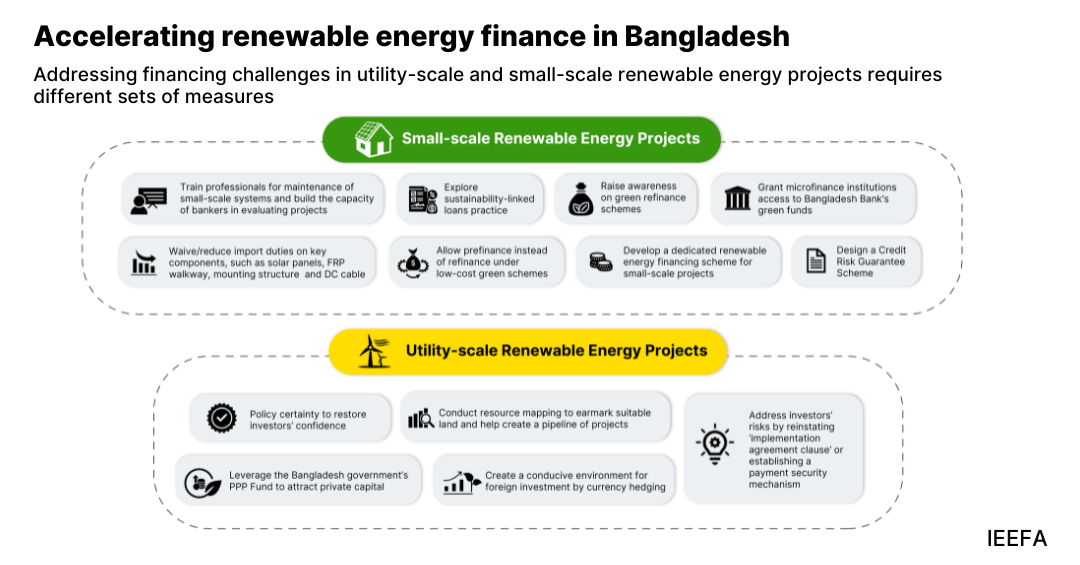 - নবায়নযোগ্য জ্বালানির ছোট প্রকল্পে (ছাদভিত্তিক সৌরবিদ্যুৎ, সৌরসেচ ইত্যাদি) বিনিয়োগ বাড়াতে হলে, ঝুঁকি প্রশমনের স্কিম (credit risk guarantee scheme) এবং বিশেষায়িত সবুজ অর্থায়ন তহবিল গঠন ও আমদানি শুল্ক ছাড় দেয়া যেতে পারে।