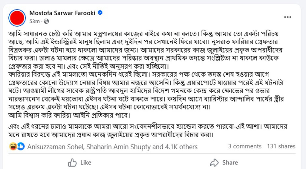 ঢাকাই সিনেমার নায়িকা নুসরাত ফারিয়ার গ্রেপ্তারের ঘটনাকে ‘বিব্রতকর’ বর্ণনা করে ফারুকী বলেন, “আমাদের সরকারের কাজ জুলাইয়ের প্রকৃত অপরাধীদের বিচার করা। ঢালাও মামলার ক্ষেত্রে আমাদের পরিষ্কার অবস্থান প্রাথমিক তদন্তে সংশ্লিষ্টতা না থাকলে কাউকে গ্রেপ্তার করা হবে না এবং সেই নীতিই অনুসরণ করা হচ্ছিল।