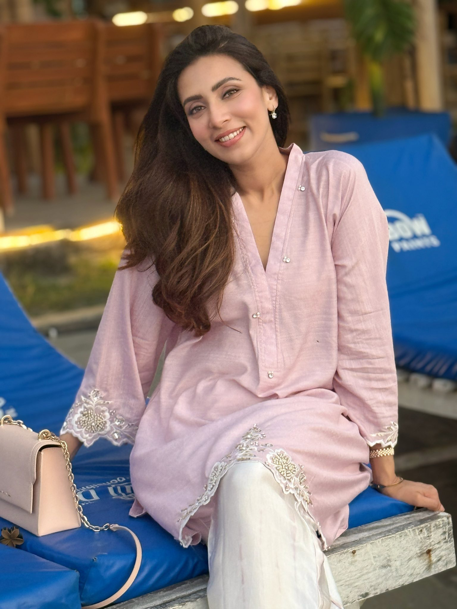 মিমের পড়নে ছিলো হালকা গোলাপি রংয়ের কামিজ এবং সাদা প্যান্ট। কামিজটির হাতায় সাদা সুতোর কারচুপি কাজ পোশাকটিকে এক অনন্য মাধুর্য দিচ্ছিলো। তার এই সাদা-মাটা লুক সমুদ্রের স্বচ্ছতার সাথে মিশে এক অদ্ভুত সৌন্দর্য এনে দিয়েছে ছবিগুলোতে।