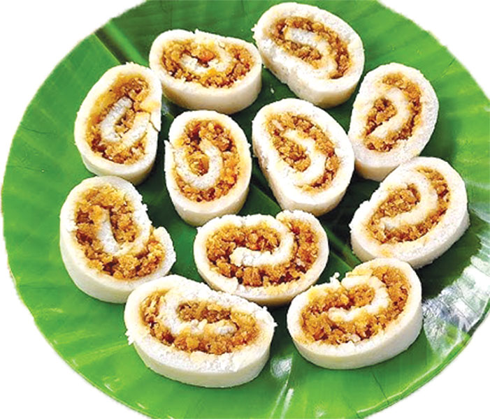 দ্বিতীয় ধাপ: চুলায় প্যান বসিয়ে পানিতে লবণ দিয়ে ফুটিয়ে নিন। চালের গুঁড়া ঢেলে দিয়ে ভালো করে মিশিয়ে নিন। চুলা বন্ধ করে ১০ মিনিট ঢেকে রাখুন। এরপর ভালো করে মেখে দুইটি ডো তৈরি করুন। মোটা করে রুটি বেলে নিন। রুটির চারপাশ কেটে স্কয়ার শেপ দিন। নারিকেল পুর দুই ভাগ করে রুটিতে সমান ভাবে ছড়িয়ে দিয়ে রোল করে নিন।